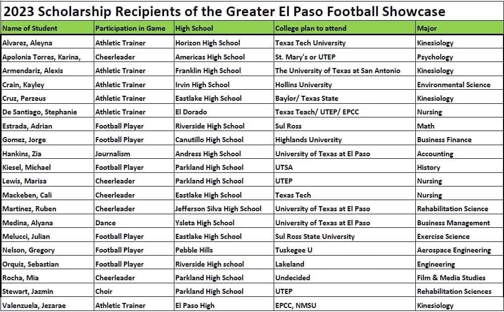 Congratulations to our class of 2023 scholarship recipients. To close out our 30th Anniversary, we will reward 20 Greater El Paso Football Showcase senior participants in Football, Band, Cheer, Dance, Choir, JROTC, Mascots, Athletic Trainers, and Sports Media with $40,000 in scholarship money.