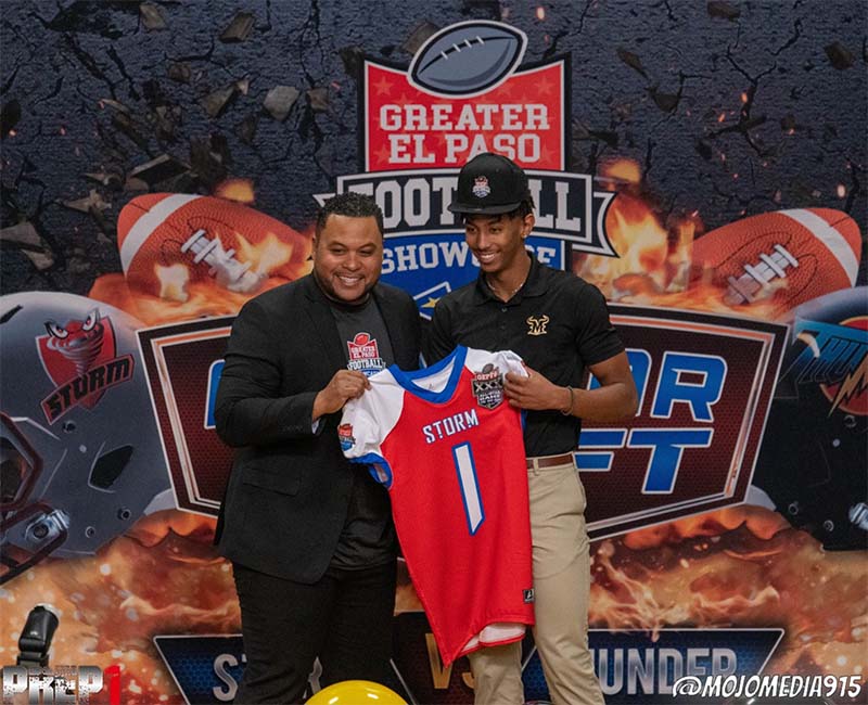 In true format of the draft when the player was selected his name was rushed out to the stage in the atrium where our sponsor of the draft and commissioner Oscar Leeser read off the picks. It was no surprise to have our city’s stand out quarterback and future San Diego State star from El Dorado High School Mr. Cedarius Barfield have his name called as the first overall pick of the draft to the Blue Thunder. Cedarius was greeted at the stage with his jersey and cap and then ushered onto the stage for photos and a media blitz awaiting to speak to him. Everything went about as good as we could’ve imagined. Our biggest problem we ran into was hitting capacity about 20 minutes before the draft even began. There was standing room only with close to 1000 people in attendance. The upper level was filled with cheerleaders and spectators. The bottom floor was a sea of people all congregating awaiting to see who the next pick would be. A huge success that was put together flawlessly by our committee. To see the faces of the players and their families as their name was called made everything worthwhile. There’s no doubt in my mind this draft will be a permanent memory and highlight these student athletes of El Paso will remember for the rest of their lives. I want to thank everyone involved in putting this together. Our sponsors, committee members, school districts, athletic directors, coaches, student athletes and parents.
